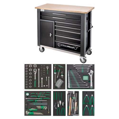 Stahlwille 98830194, Banc de lucru mobil WB 621/161QR, 7 sertare cu glisare completa, compartiment lateral, blat din lemn, inchidere centralizata si 161 de unelte